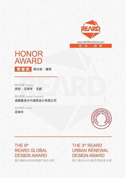 此外,資陽花樣年·花郡于11月提前完成全年簽約回款任務(wù)。11月27-28日,該項目在第六屆REARD全球地產(chǎn)設(shè)計大獎云頒獎盛典上斬獲居住類·建筑榮譽獎。