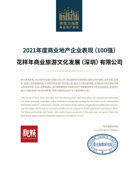 11月2日-3日,由觀點地產(chǎn)機構(gòu)主辦的2021觀點商業(yè)年會在上海舉行,會議現(xiàn)場發(fā)布了《表現(xiàn)力指數(shù)·2021年度商業(yè)地產(chǎn)表現(xiàn)報告》,并進行“表現(xiàn)力指數(shù)·2021年度商業(yè)地產(chǎn)表現(xiàn)”研究成果的發(fā)布儀式?;幽晟搪梦膽{借過去一年的優(yōu)異表現(xiàn),榮獲“表現(xiàn)力指數(shù)·2021年度商業(yè)地產(chǎn)企業(yè)表現(xiàn)100強(第54位)”、“中國商業(yè)地產(chǎn)管理企業(yè)表現(xiàn)TOP10”兩項大獎。