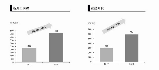 2018年,花樣年通過周轉(zhuǎn)提速,年內(nèi)工程面積大幅增長,新開工面積和在建面積均增長超過1倍,其中新開工面積達(dá)到463萬平方米,在建面積594萬平方米,確保公司2019年可售資源充裕。