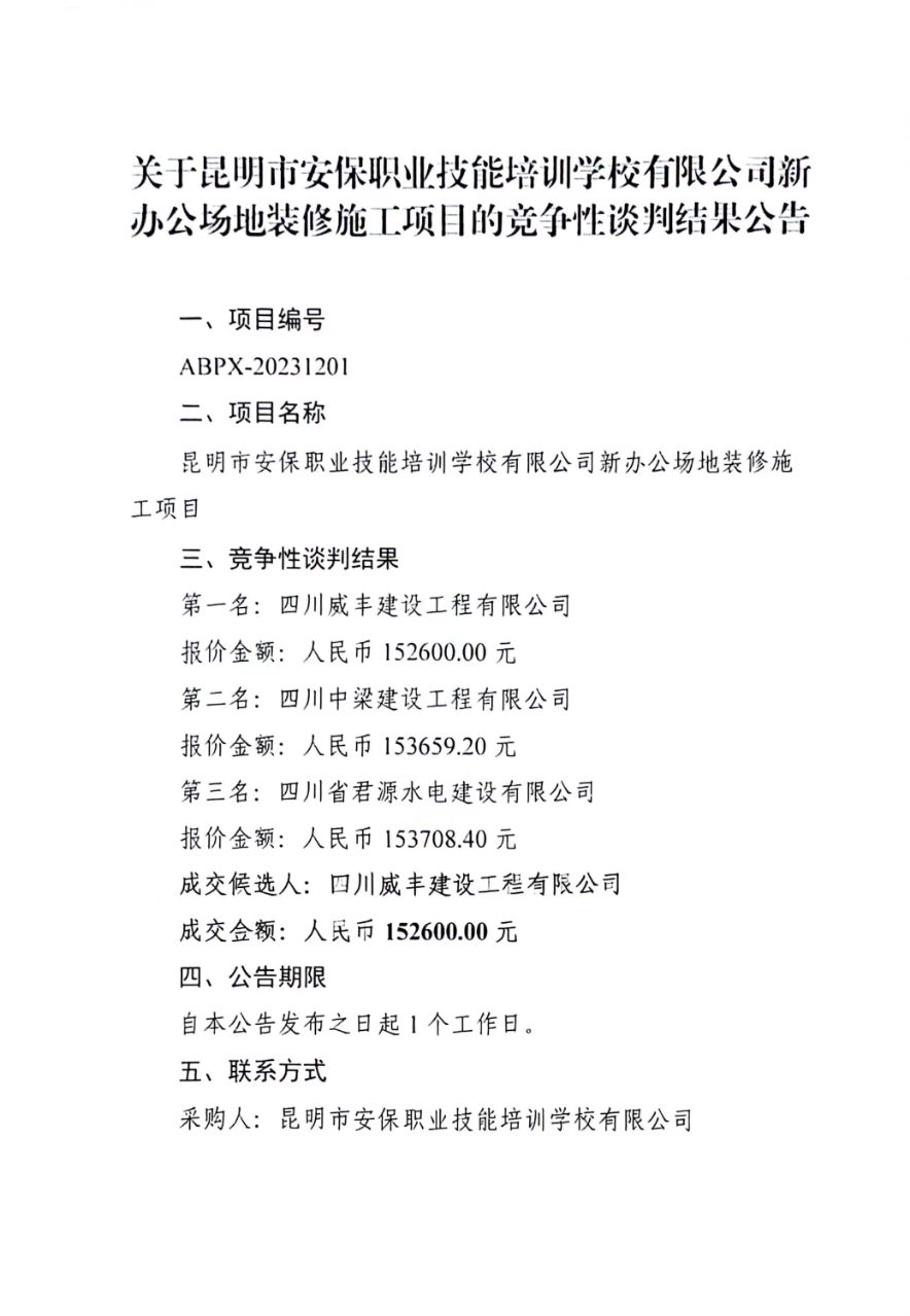 昆明市安保職業(yè)技能培訓(xùn)學(xué)校有限公司新辦公場地裝修施工項目競爭性談判結(jié)果公告